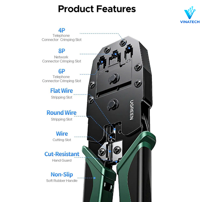 Kìm bấm mạng Ugreen NW304 hỗ trợ nhiều loại đầu kết nối phổ biến trong hệ thống mạng và điện thoại:
