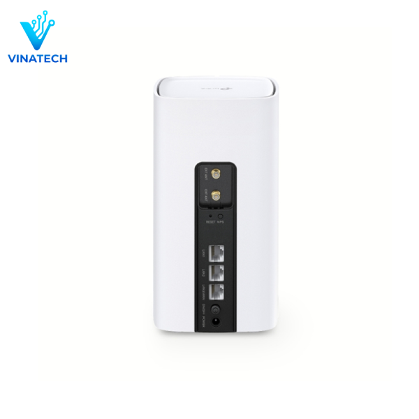 Mặt trước có hệ thống đèn LED thông báo trạng thái hoạt động. Phần đáy được bố trí khe tản nhiệt, khay SIM và thông tin Wi-Fi mặc định. Ở mặt sau, router có đầy đủ các cổng: anten mở rộng 5G/4G, LAN Gigabit, LAN/WAN Gigabit, cùng phím reset, WPS, công tắc nguồn và cổng cấp điện.